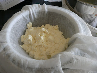 Time to strain - Place a strainer on top of a bowl to catch the whey. Place a butter muslin or cheese cloth on top of the strainer. With a slotted spoon, scoop up the curds and place them onto the cloth. Reserve the whey in the saucepan as you'll need it in 2 hours. Whey will continue to drain from curds for 15 minutes.